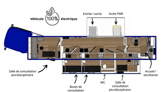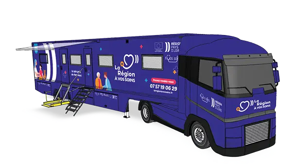 Depuis le 17 novembre, la Région des Pays de la Loire et l’association À vos soins expérimentent un centre de santé mobile en Sarthe, dans la communauté de communes du Perche Émeraude. De la taille d’une semi-remorque extensible, le camion est équipé d’une salle d’attente, d’un espace d’accueil, de sanitaires, d’une kitchenette pour les équipes médicales, et de 4 espaces de consultations.
